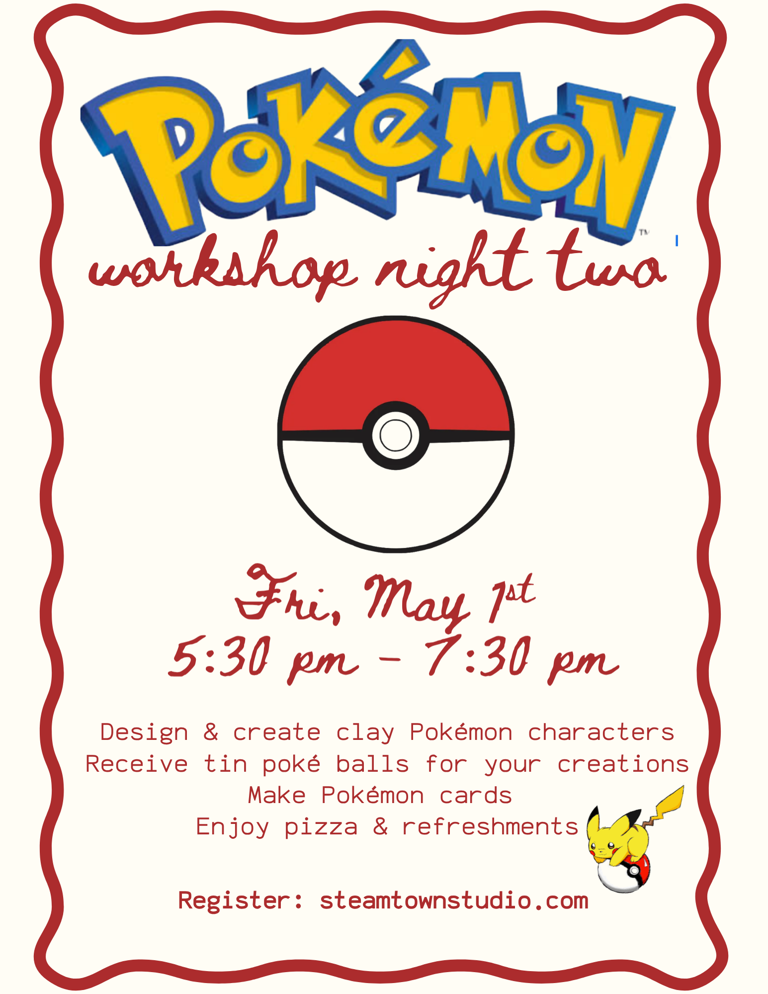 Design and build your own Pokémon characters using air-dry clay. Each attendee will receive a Poké Ball tin to store their creations, and we’ll even make custom Pokémon cards for your unique characters.